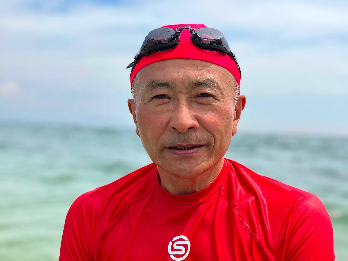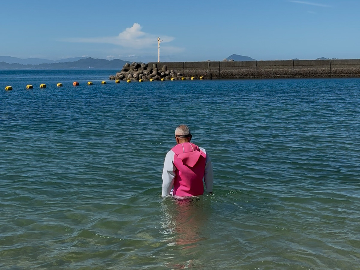 江口さんは鹿島に到着すると周囲の海の状態を確認し、会場となる海水浴場へ向かいました。海水浴場に着くと江口さんは躊躇うことなく海に入り、綺麗なうつ伏せの状態で浮き始め、静かに海と一体化していました。